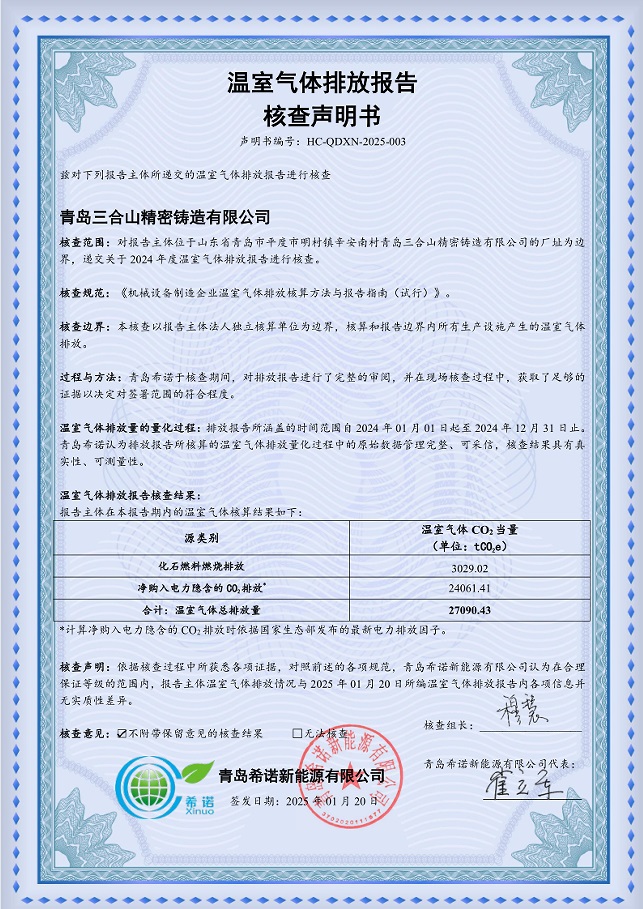 青岛三合山精密铸造有限公司温室气体排放报告核查声明书